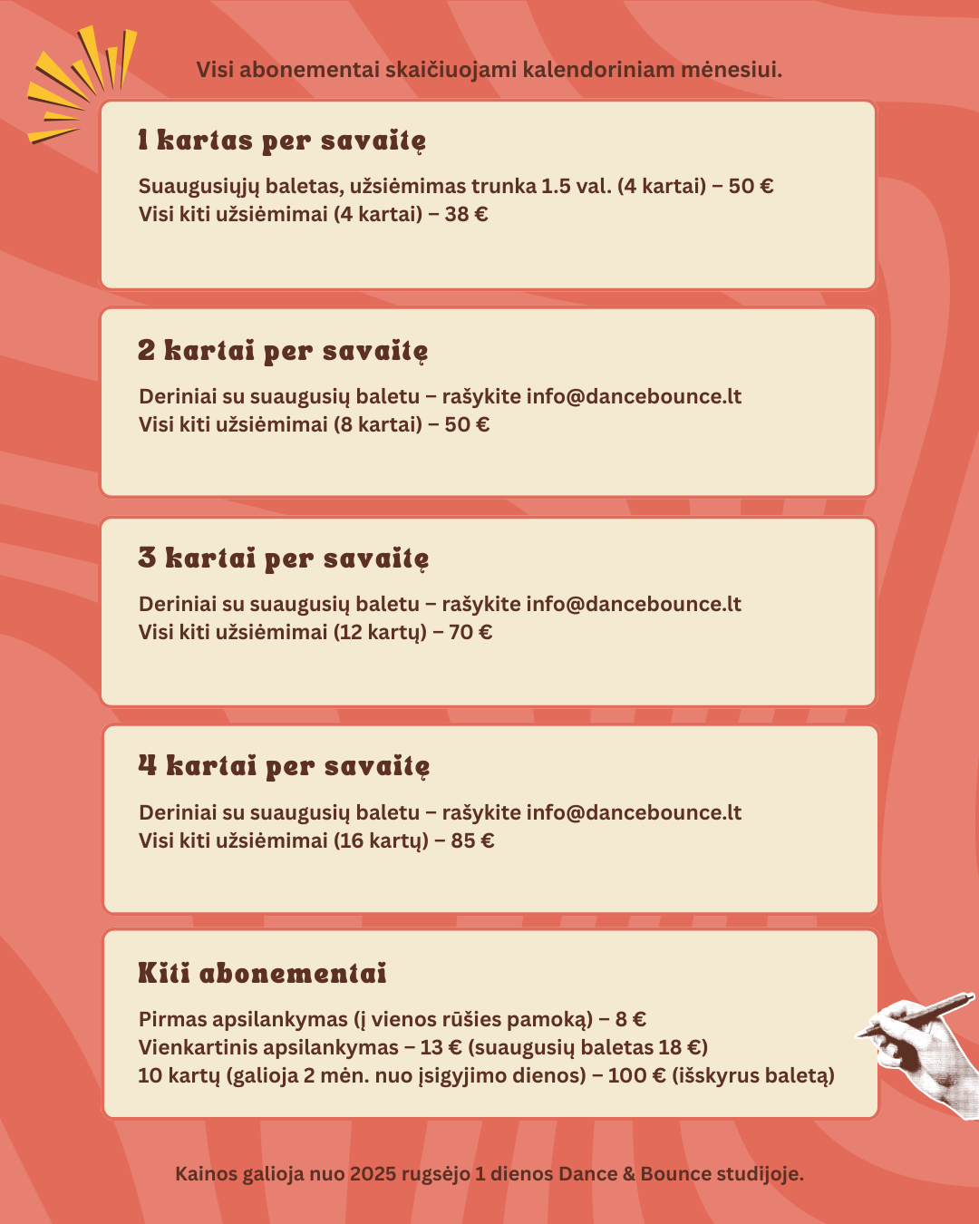 Jei neatvykstate į pirmą treniruotę, kita bandomoji treniruotė (į tą patį užsiėmimą, kurį registravotės) į baletą 18 eur, į kitus užsiėmimus 13 eur (nusprendus įsigyti abonementą, šis mokestis taip pat įsiskaičiuotų į pasirinkto abonemento kainą).